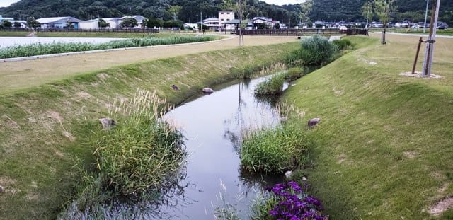 全面芝生の美野里池で水をキレイにするカラクリに感服! 【蒲生】