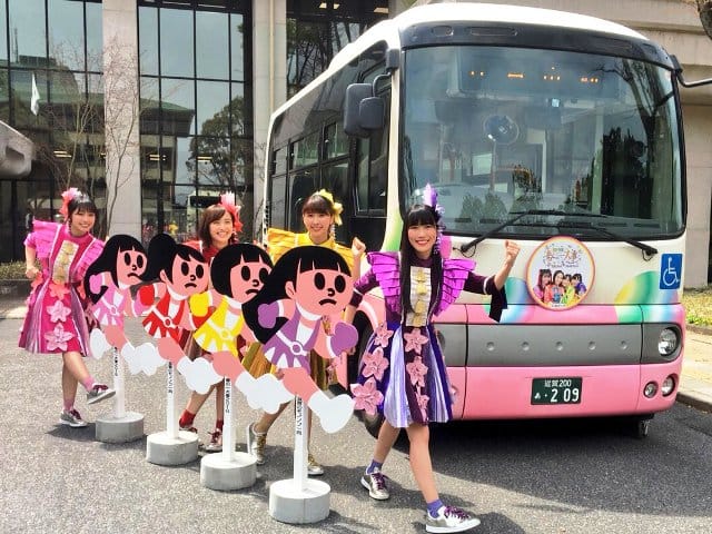 市役所で春一バスをバックに飛び出し坊やと同じポージングを!飛び出せももクロ!